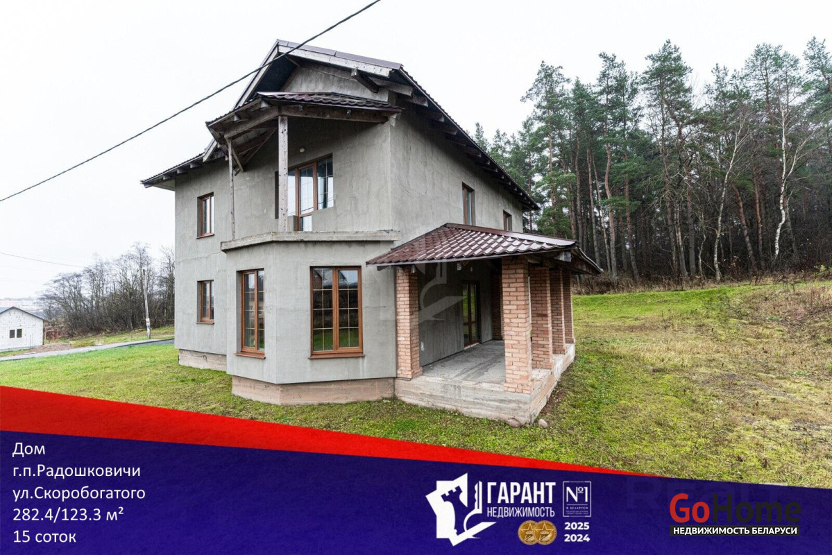 Коттедж с прекрасной планировкой для большой семьи.Шикарное расположение рядом с лесом.Улица расположена в новом районе посёлка Радошковичи.Общая площадь- 282 кв.м.Участок -15 соток.Год постройки- 2018Готовность примерно 75-80%Фасад утеплёнКанализация- трубы заложены, но колодца нет.Кровля- металлочерепицаЭлектричество 220/380 В, разведено по дому, кроме кухни.Отопление планировалось электрическое по льготному тарифу.Мощность на отопление 15 кВтМощность на электроснабжение 6 кВтСтены внутри- оштукатуреныНа первом этаже залита стяжка полаПерекрытие второго этажа- временноеВодоснабжение центральноеГаз примерно на расстоянии 20 метров.По проекту – кухня 25 кв.м. плавно переходит в просторную гостиную с выходом на террасу.В этой комнате очень много света за счёт большого количества окон.На первом этаже планировалась котельная, а также в будущем площадь позволяет разместить баню-сауну.Просторный холл придаёт дому дополнительную роскошь благодаря размерам.Изюминка второго этажа- панорамный вид из балкона на локацию.В доме на каждом этаже предусмотрены санузлы.Под общей кровлей-гараж. Общей площадью 29.4кв.м.Дорога по улице асфальтирована полностью до нашего объекта. Имеется большая стоянка.Дом требует завершения строительства.Недалеко от дома находится школа, в посёлке два детских сада,поликлиника, магазины, почта, аптеки и всё необходимое для проживания.Транспортное сообщение с Минском есть.