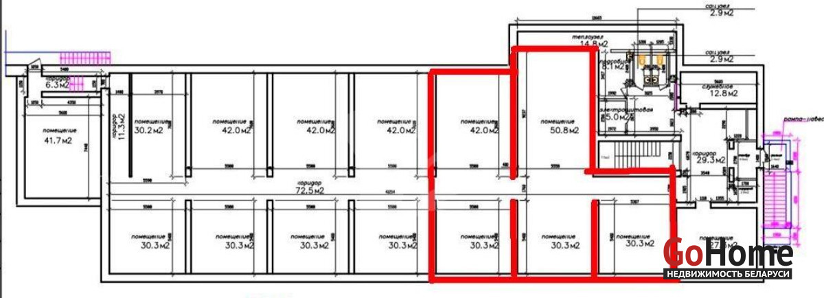 Площадью: 42м, 50,8м, 30,3м, 30,3м, 30,3м с арендной ставкой за метр 20 бел.руб.