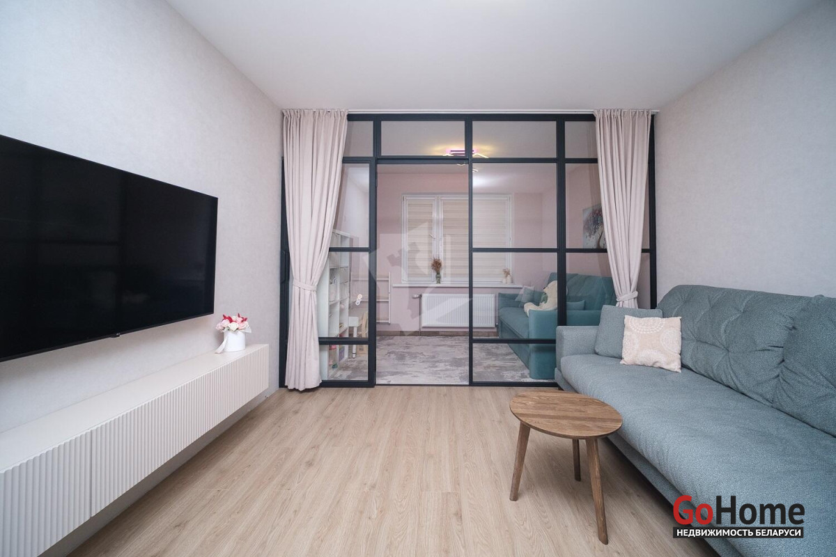 Продуманное зонирование пространства, стеклянная перегородка с эффектом звукоизоляции.