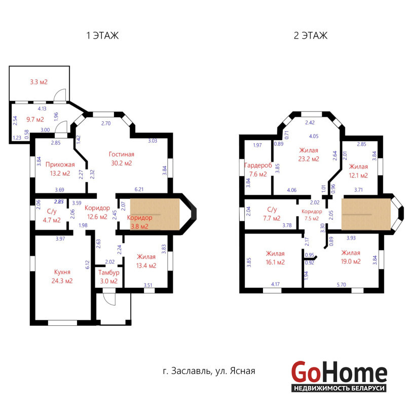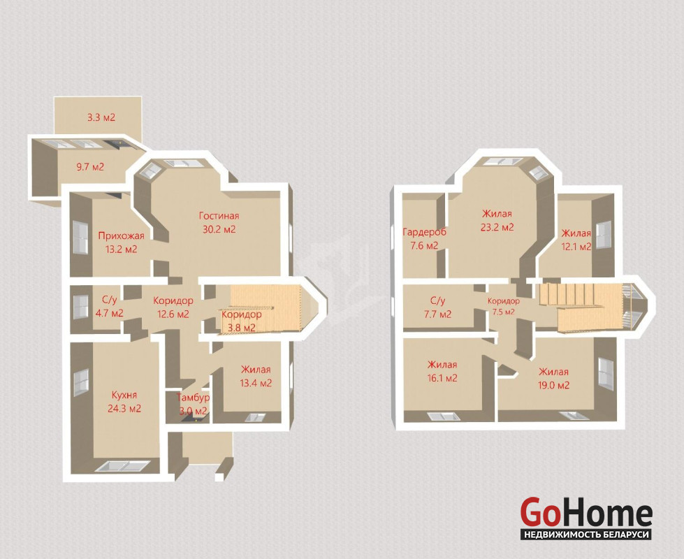 На первом этаже расположились просторная (30,2м2) гостиная с эркерным окном. Почти не уступает гостиной в размере двадцатичетырёхметровая кухня! Хол – 13 м2 Тринадцатиметровая комната кажется маленькой на общем фоне. На втором этаже – четыре умеренно просторные комнаты (23, 19, 16 и 12 квадратных метра). К большой комнате примыкает восьмиметровая гардеробная