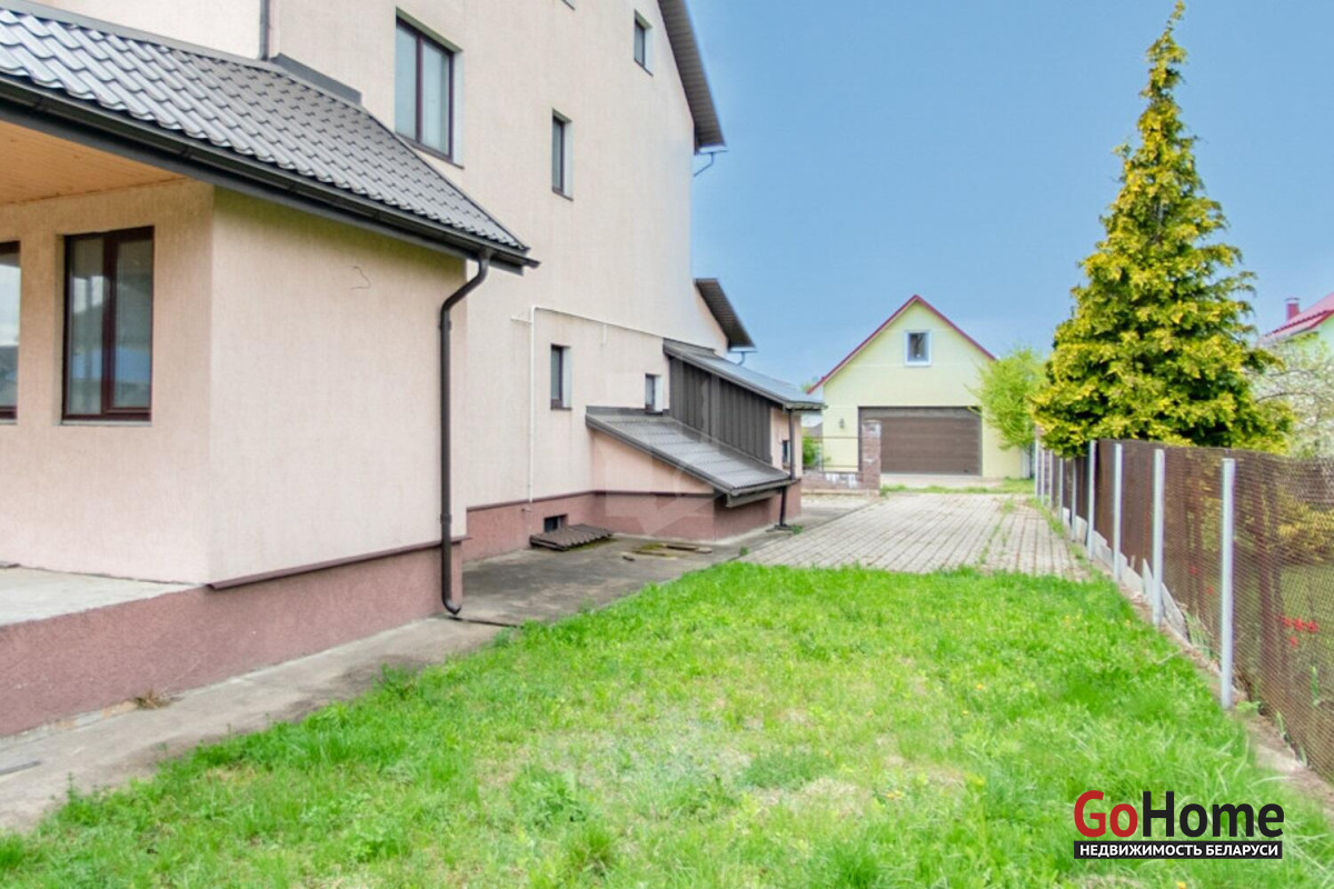 Асфальтированная дорога ведет прямо к дому. У дома три входа: к каждому уложена тротуарная плитка. Помимо самого дома на участке построен просторный (38м2) хозяйственный блок, с зоной для барбекю, задумывавшийся, как летняя кухня или гостевой домик