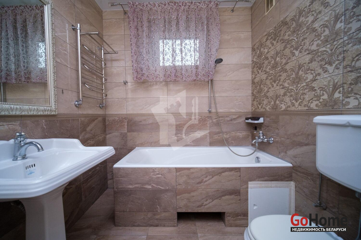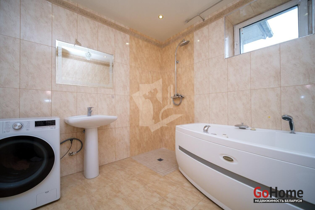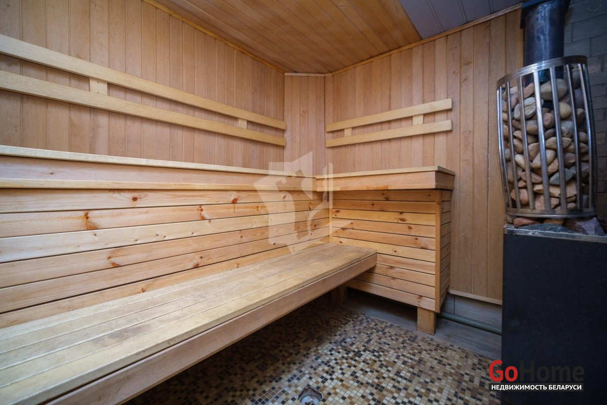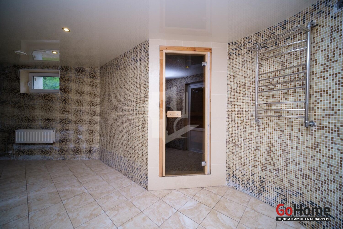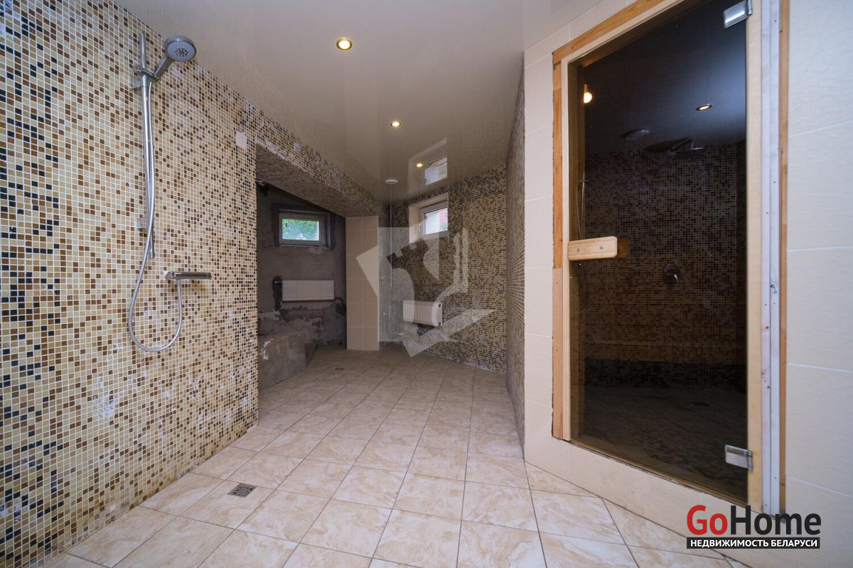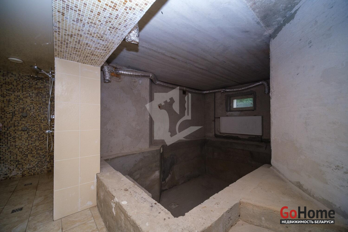 На цокольном этаже гараж с секционными воротами, бойлерная, санузел, комната для отдыха (тренажерный зал), баня (дровяная печь), душевая с бассейном (требует доработки).