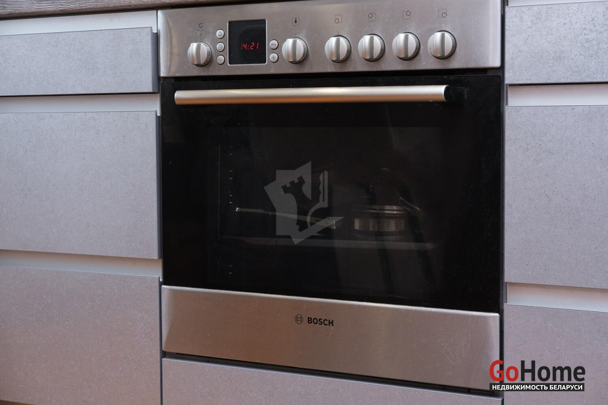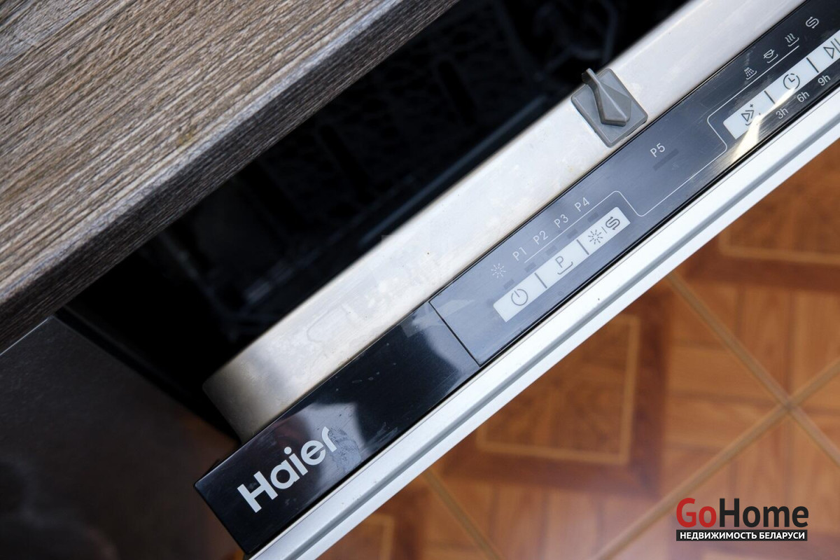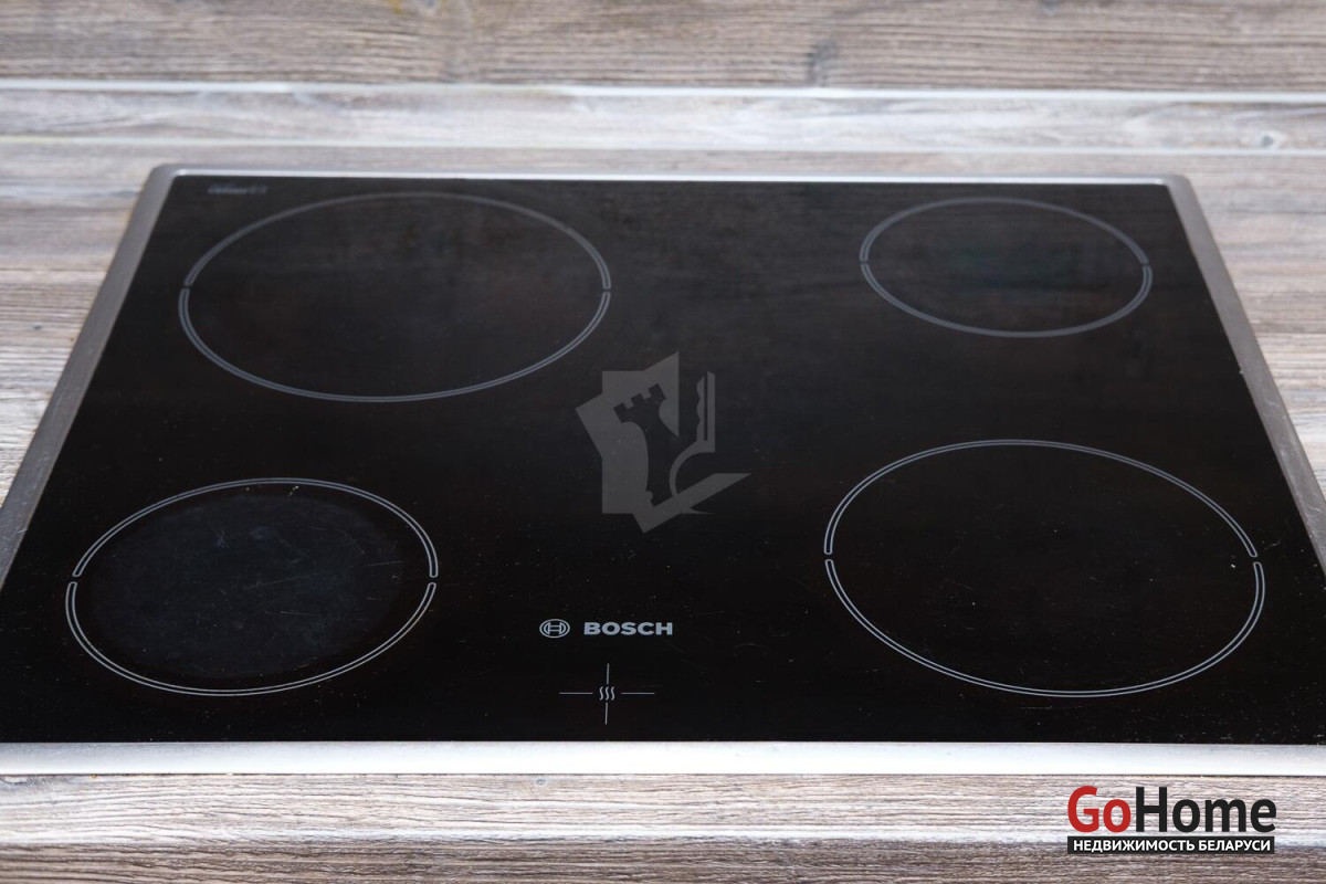 На кухне встроена новая бытовая техника:— посудомоечная машина Haier,— вытяжка Akro,— варочная поверхность Bosch,— духовой электрический шкаф Bosch.Дверь на кухню отсутствует, что делает пространство более открытым и удобным для зонирования.