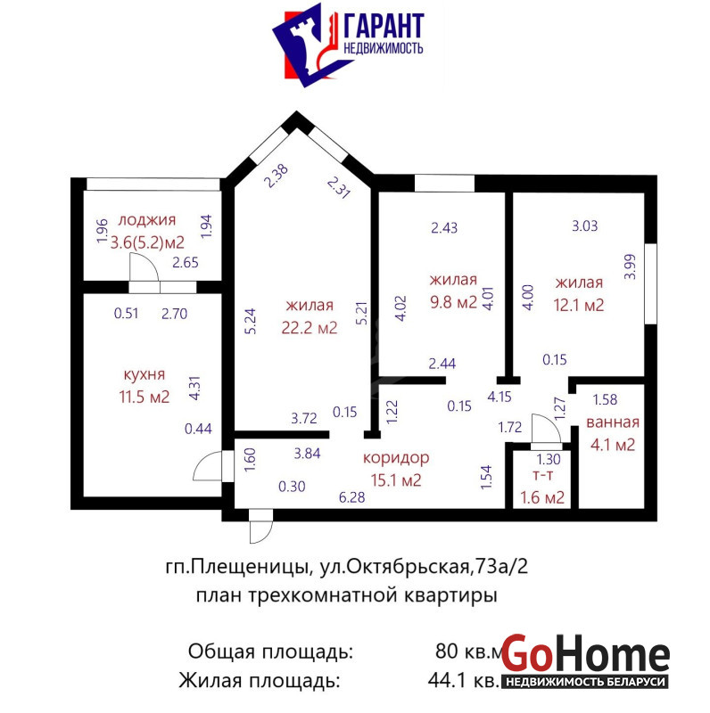 Общая площадь 76.4 кв.м. (по СНБ 80 кв.м.) / жилая 44.1 кв.м. / кухня 11.5 кв.м. Высота потолков 2.54 м.