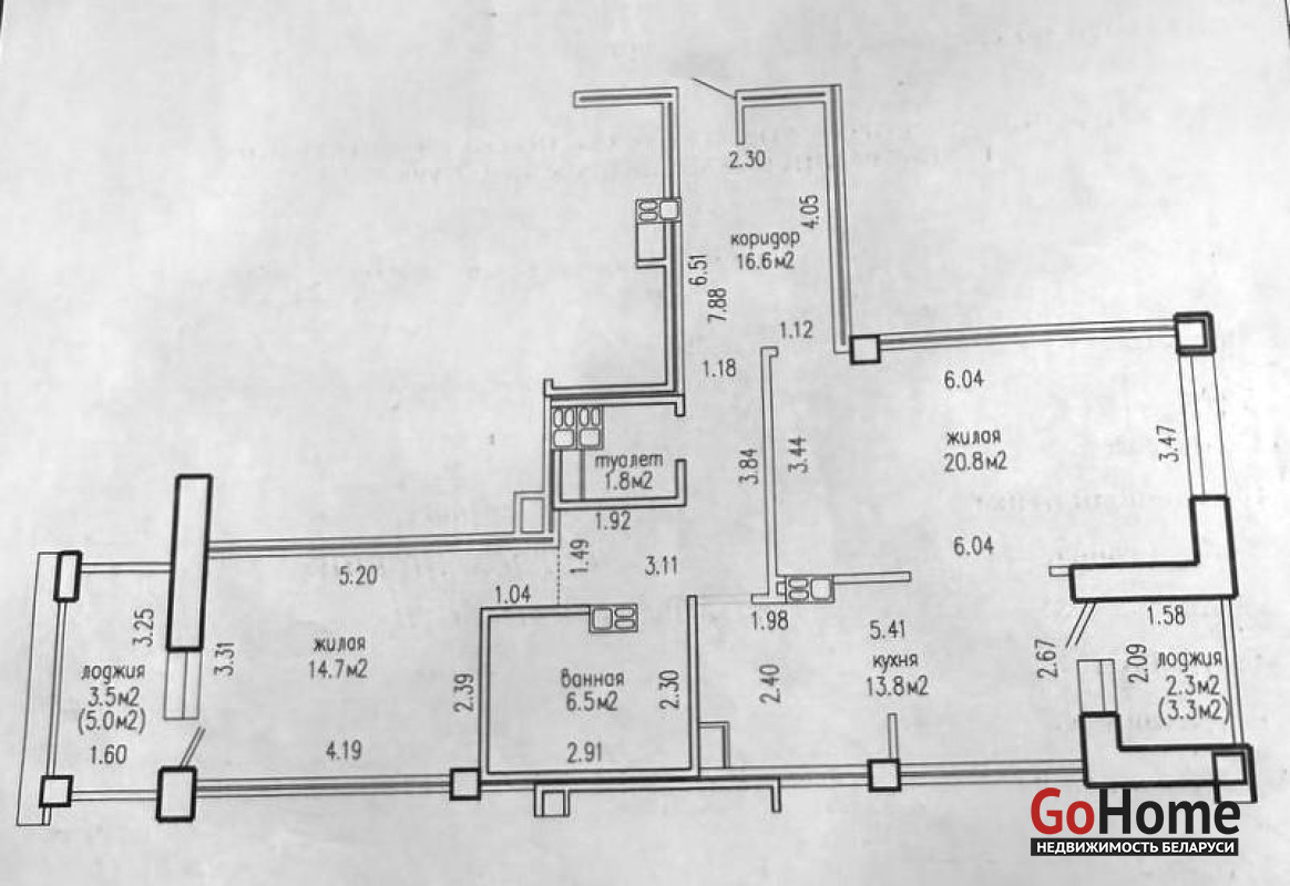 - площадь по СНБ — 80,0 м², общая — 74,2 м², жилая — 35,5 м²;