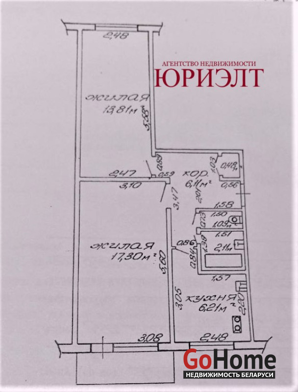 Общая площадь 47 м2.Комната 17 и 14 м2.