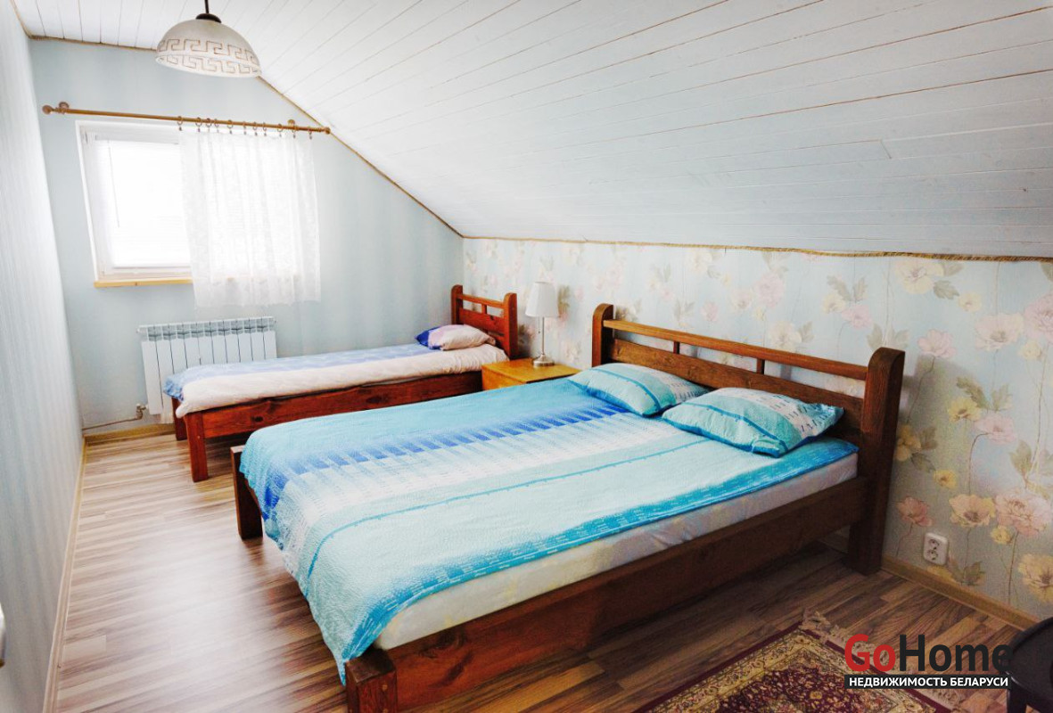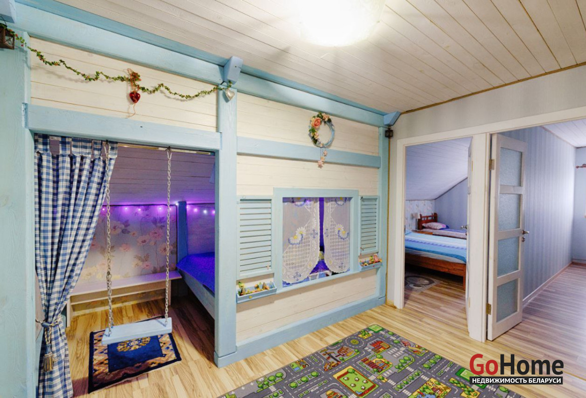 На втором этаже 4 просторных спальных комнаты с двуспальными и односпальными кроватями и туалетная комната. 5 спальня - стилизованный детский домик-кровать на два полноценных спальных места(матрас 160* 200).