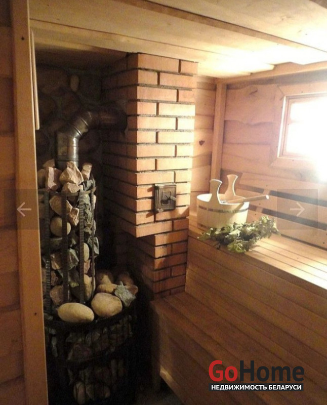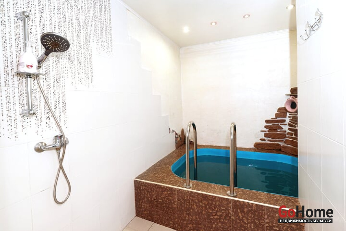 На первом этаже просторный холл, мини-кухня со всей необходимой техникой и посудой, туалет, душ, баня и купель с холодной водой.