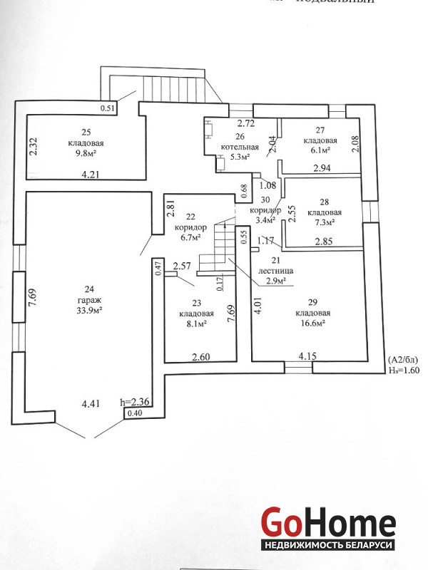Имеется цокольный этаж, где расположены кладовые, котельная и гараж.