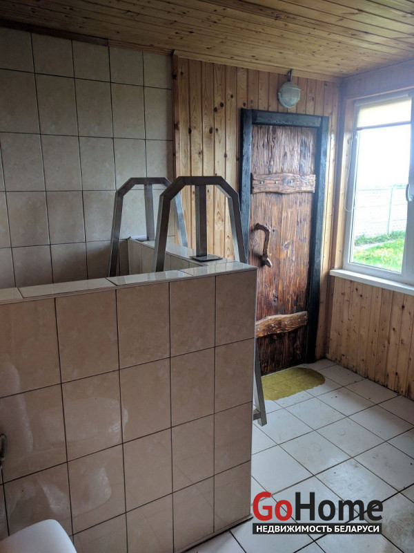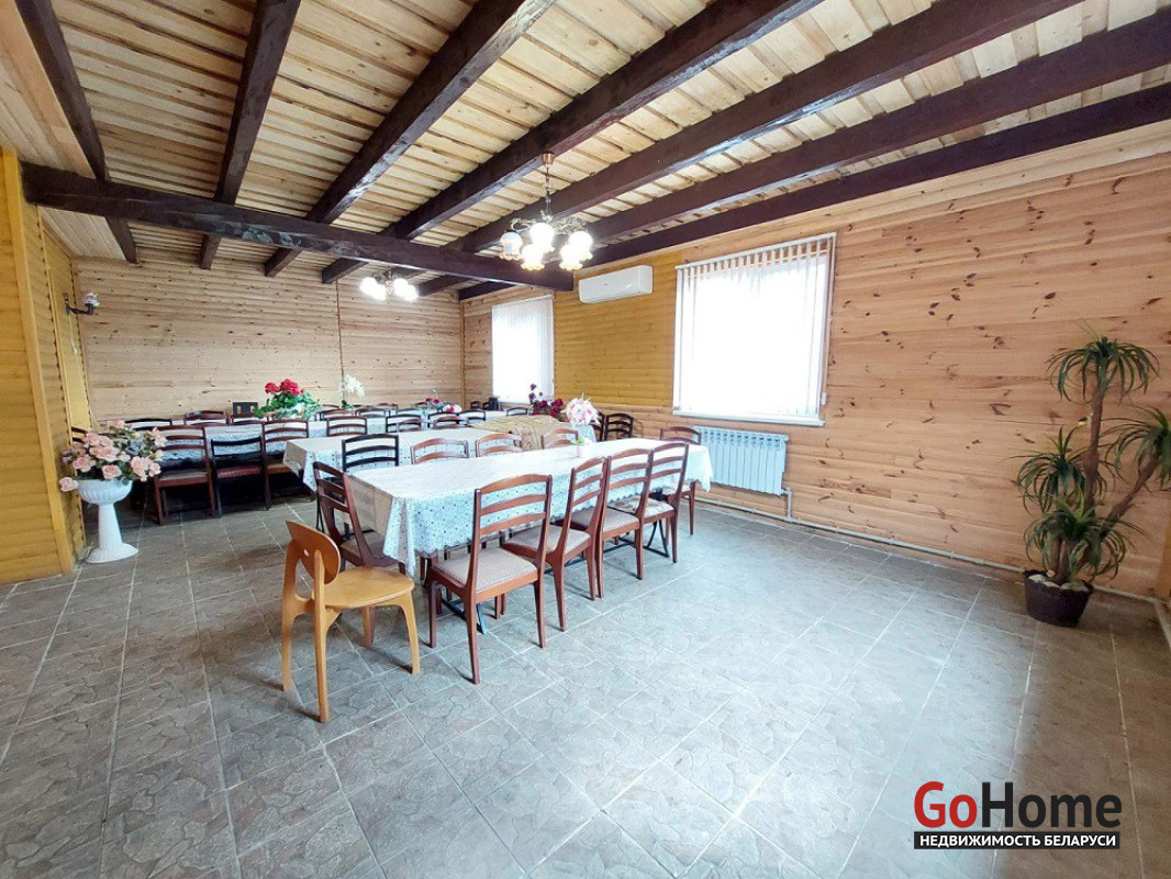 Второй дом блочный, отделан деревом, 2015 года постройки, двухэтажный, мансардного типа. Общая площадь здания – 179 м.кв. На первом этаже расположен зал на 150 м.кв для проведения банкетов, любого вида торжеств. Выделена зона отдыха с камином, 3 санузла, помещение с кухонным оборудованием. На полу –плитка. На втором этаже комната на 10 спальных мест, терраса. Вода – скважина, электричество – центральное, канализация – местная. Крыша-металлочерепица с организованным водостоком.