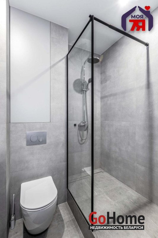 -Санузел совмещенный, оформлен в стиле европейского минимализма. Стены - крупный формат плитки под бетон, встроенные ниши и шкафы создают идеальную систему хранения. Подвесная сантехника, душевая без поддона с чёрным алюминиевым профилем - выбор, свойственный дизайнерским проектам класса «комфорт+». Матовая плитка по полу и стенам делает пространство визуально чистым и очень современным.