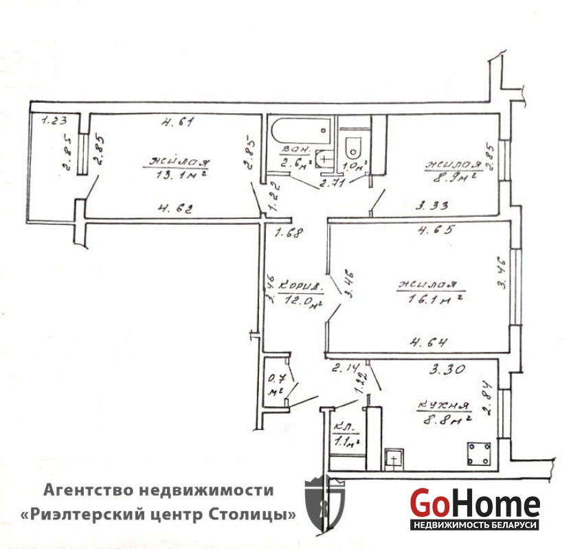 Общая площадь: 65 кв.м (жилая 35 кв.м, кухня 8.8 кв.м).