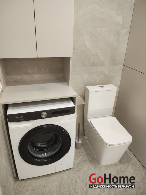 В просторной ванной комнате использована качественная сантехника. Есть система хранения. Зимой вас согреет большая ванная с атмосферной подсветкой. Для удобства сделан пол с подогревом. Установлены стиральная машина и датчики протечки.