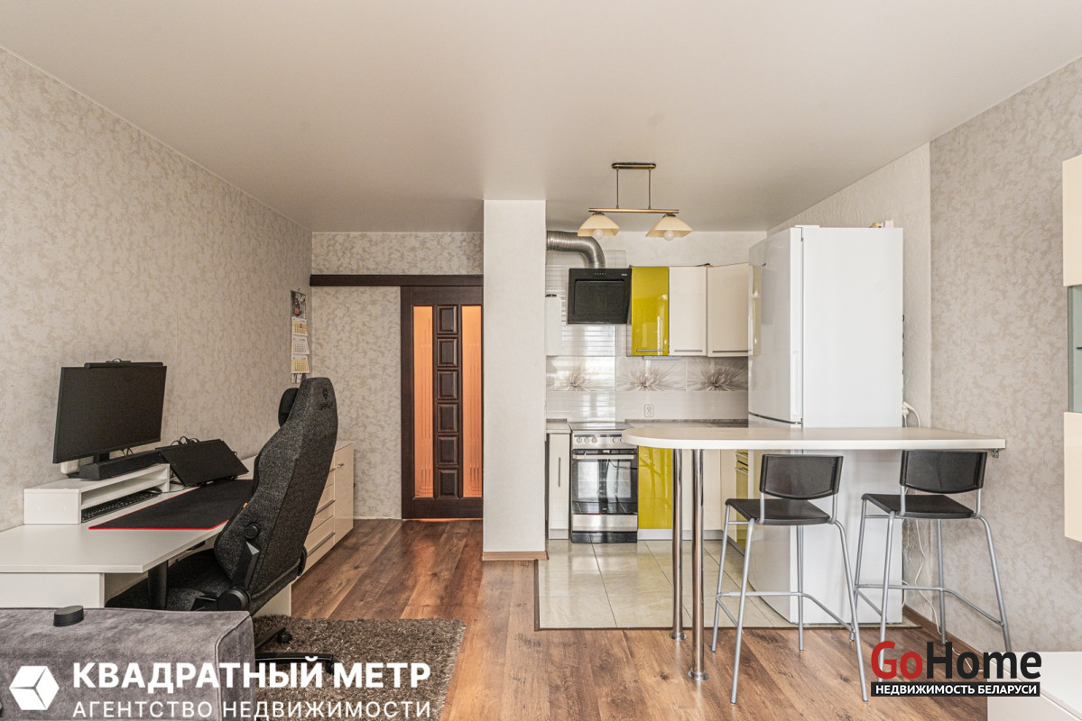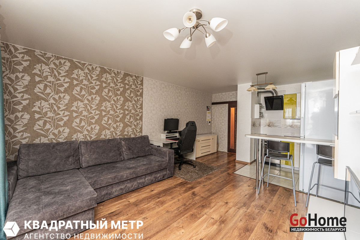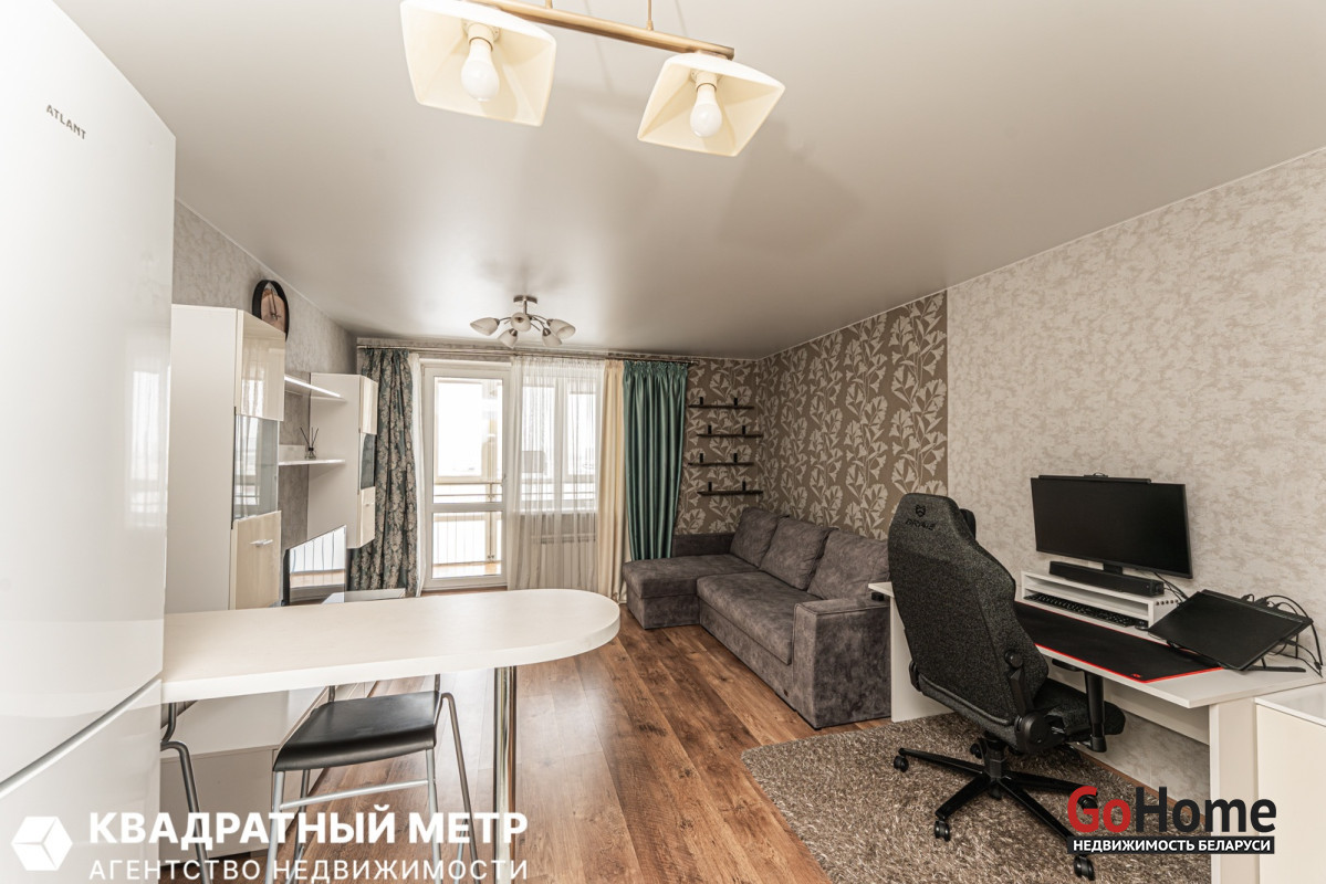 1. Просторная аккуратная, наполненная светом квартира формата Студия: мебель, ТВ-зона и большой встроенный шкаф. Полы в ванной, на кухне и прихожей оборудованы подогревом.