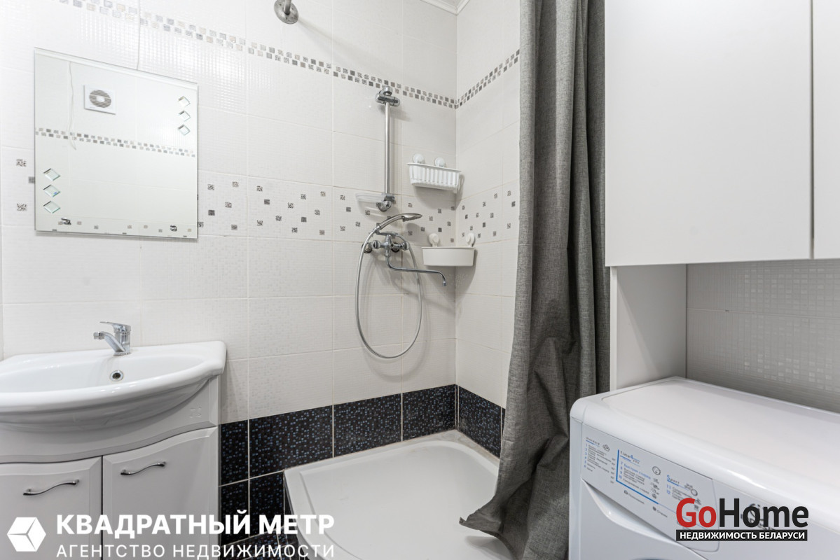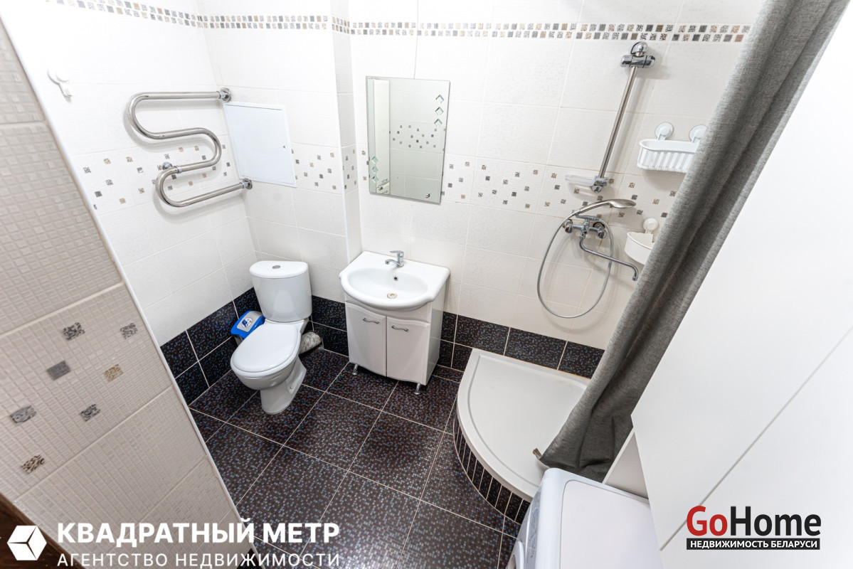 4. Просторный совмещенный санузел: оборудован душевой кабиной, мебелью и стиральной машиной.