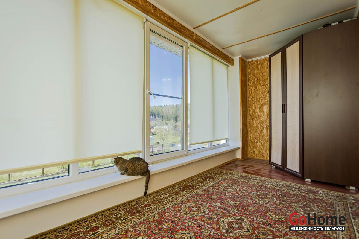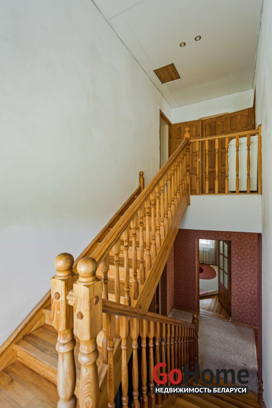Первый этаж – прихожая 13.2 м, кухня-столовая, две просторные жилые комнаты (22.5 м и 18.9 м), раздельный сан.узел. На второй этаж ведет деревянная лестница с удобным маршем. Две спальни по 14.8 м, и полностью остекленная лоджия, где для любителей флоры можно организовать зимний сад. Смотрите фото;