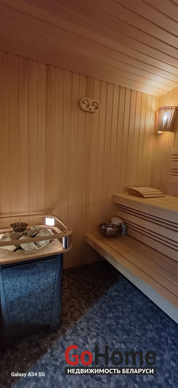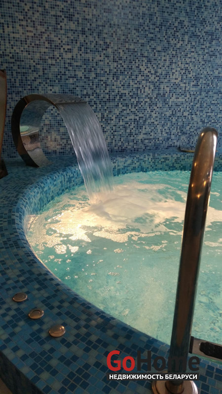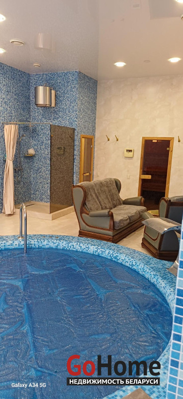 Помещение с бассейном и сауной: бассейн круглый (д.-3,2м х гл.-2м), водопад, гидромассаж, подсветка. Сауна электрическая с увлажнителем (3м х 4м). Душевая кабина, обливочное устройство - ливень. Санузел. Вибротренажер. Диван, два кресла, журнальный столик, холодильник. Выход на балкон-террасу с видом на озеро.