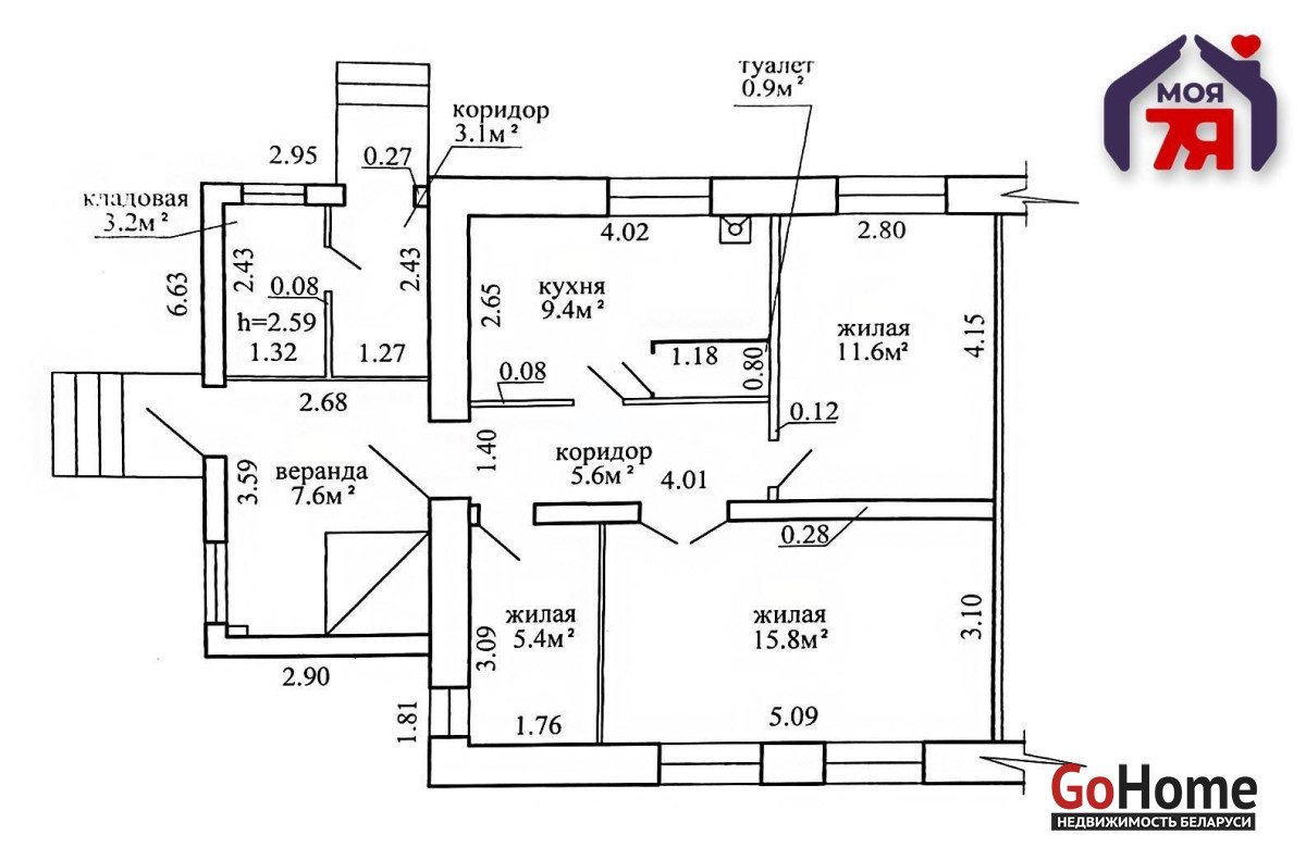 - Общая площадь дома составляет 56,3 м2, жилая площадь - 32,8 м2, площадь кухни – 9,4 м2.
