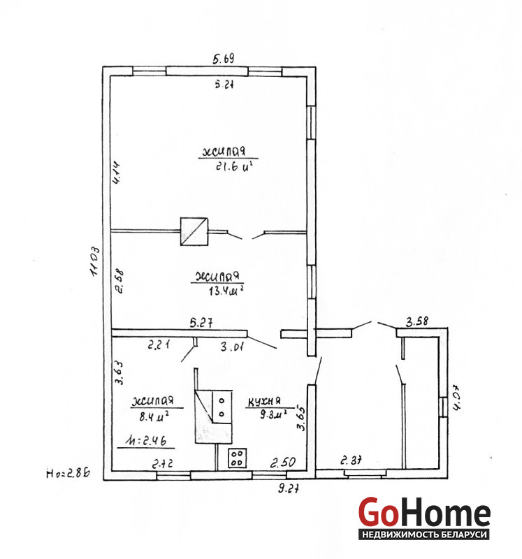 Общая площадь дома (по СНиП) – 64,6 кв.м. Высота потолков – 2,86 м.