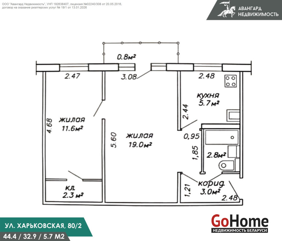 Общая площадь квартиры 44.4 м2 (есть балкон), расположена на 3/5 этаже, панельного дома 1963 гп.