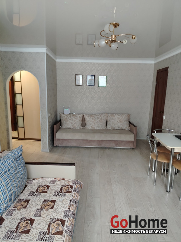 Двухкомнатная квартира полностью готова для проживания. Хороший ремонт (ламинат, стеклопакеты, металлическая входная дверь, хорошие обои, натяжные потолки, новые межкомнатные двери, современная угловая кухня, газовая варочная панель, электрический духовой шкаф, шкаф купе в коридоре, новая сантехника). Район с развитой инфраструктурой (школа, амбулатория, парк, детская площадка, магазины в шаговой доступности, сад, школа искусств, белпочта, Беларусбанк). Хорошее транспортное сообщение.