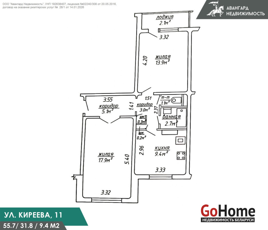 О квартире:Общая площадь (СНБ): 55,7 м2Комнаты раздельные: 17,9 м2 и 13,9 м2Кухня: 9,4 м2Этаж: 4 из 5Дом 1989 года постройки, капитальный ремонт 1991 года