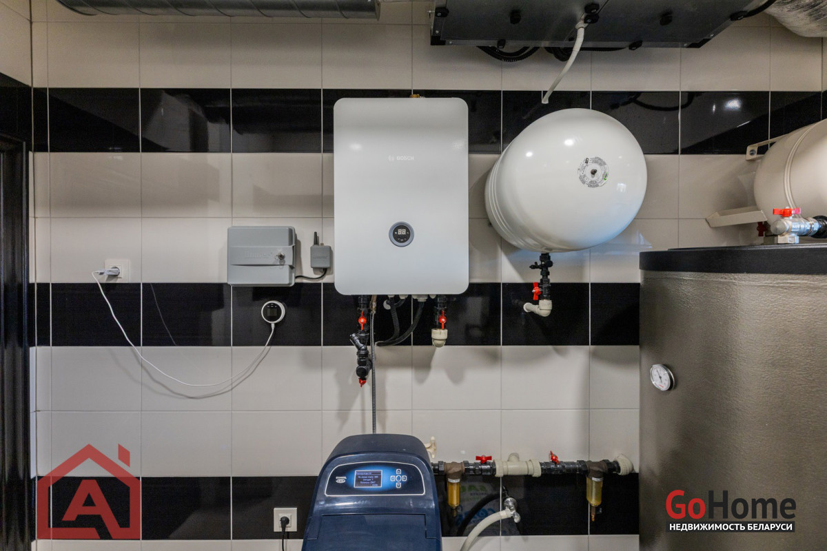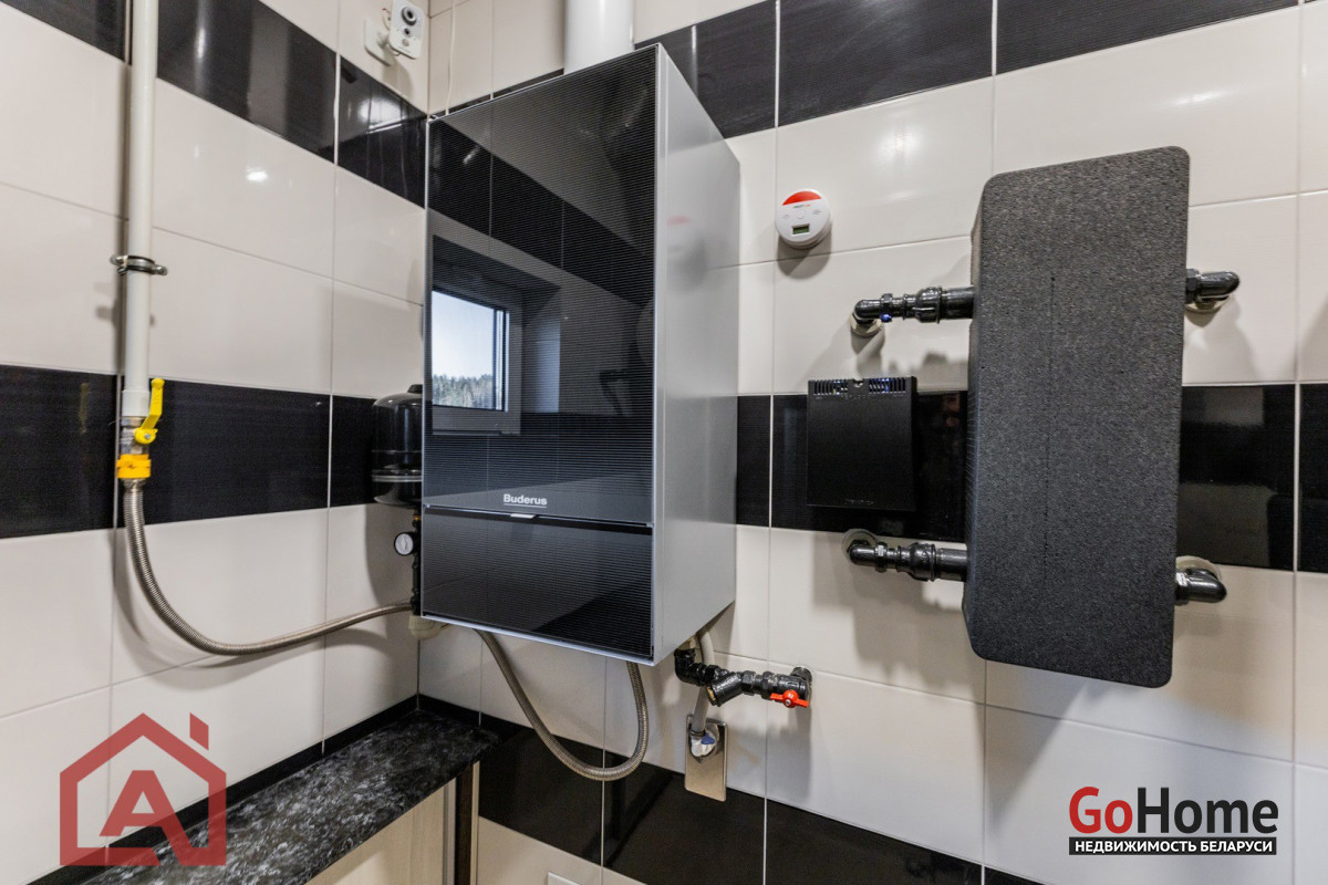 Отопление: тёплый пол-теплоноситель Antifrogen (Germany), газовый котёл Buderus 42 кВт, 9 контуров, бойлер запаса горячей воды. Установлен резервный электрический котёл отопления.