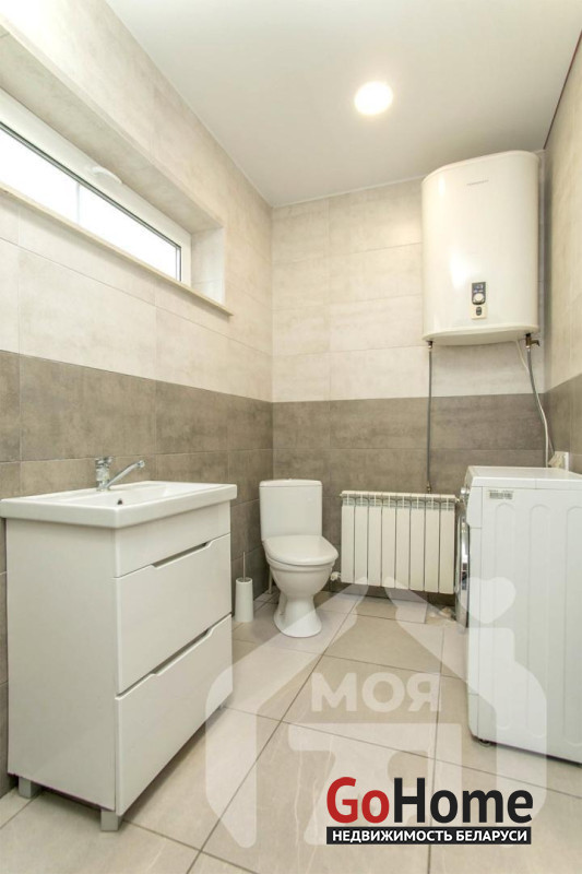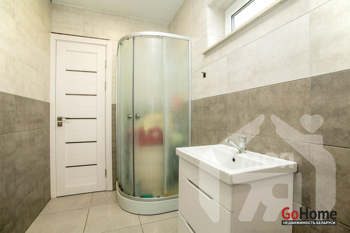 -Санузел облицован плиткой, установлена душевая кабина. В доме пластиковые стеклопакеты с отличной теплоизоляцией. Благодаря спокойной цветовой гамме и продуманным материалам дом воспринимается светлым, тёплым и просторным.