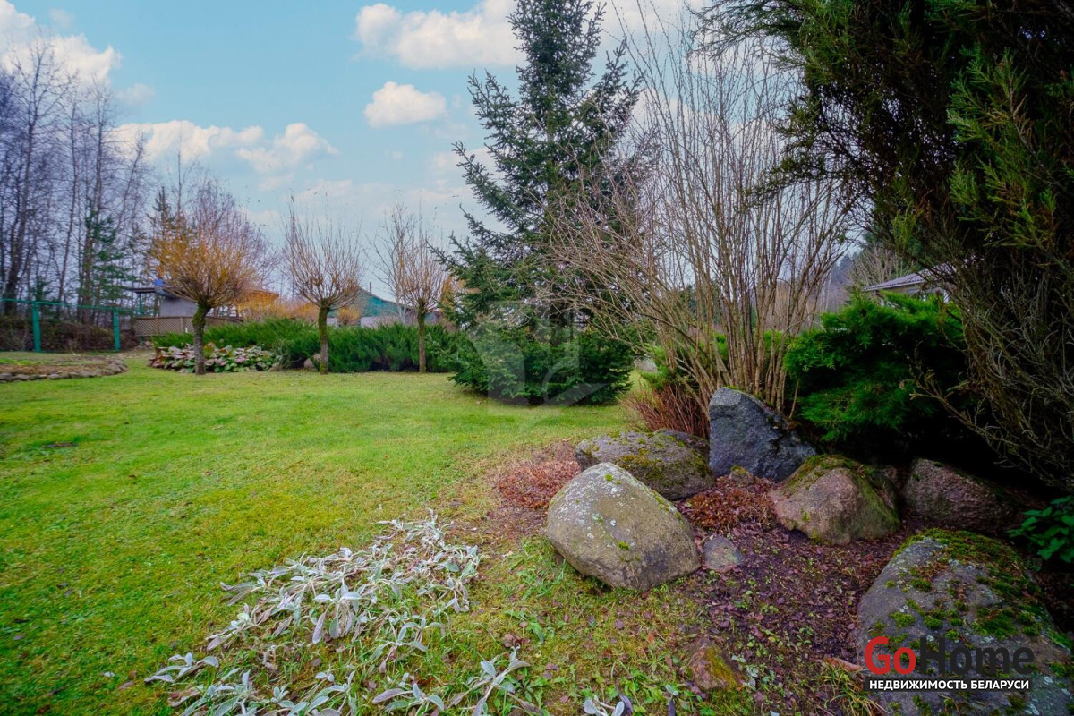 Дом расположен на краю деревни: если не знаешь – не увидишь, так ловко он прячется за деревьями. На обширном участке в 24 сотки выполнен ландшафтный дизайн. Нашлось место бане с камином и комнатой отдыха и беседке с мангалом