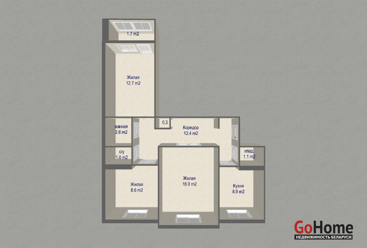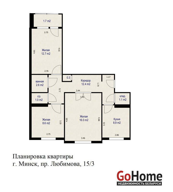 Продается просторная 3-комнатная квартира, общая площадь 65.3 кв.м., жилая 37.3 кв.м., кухня 8.9 кв.м.