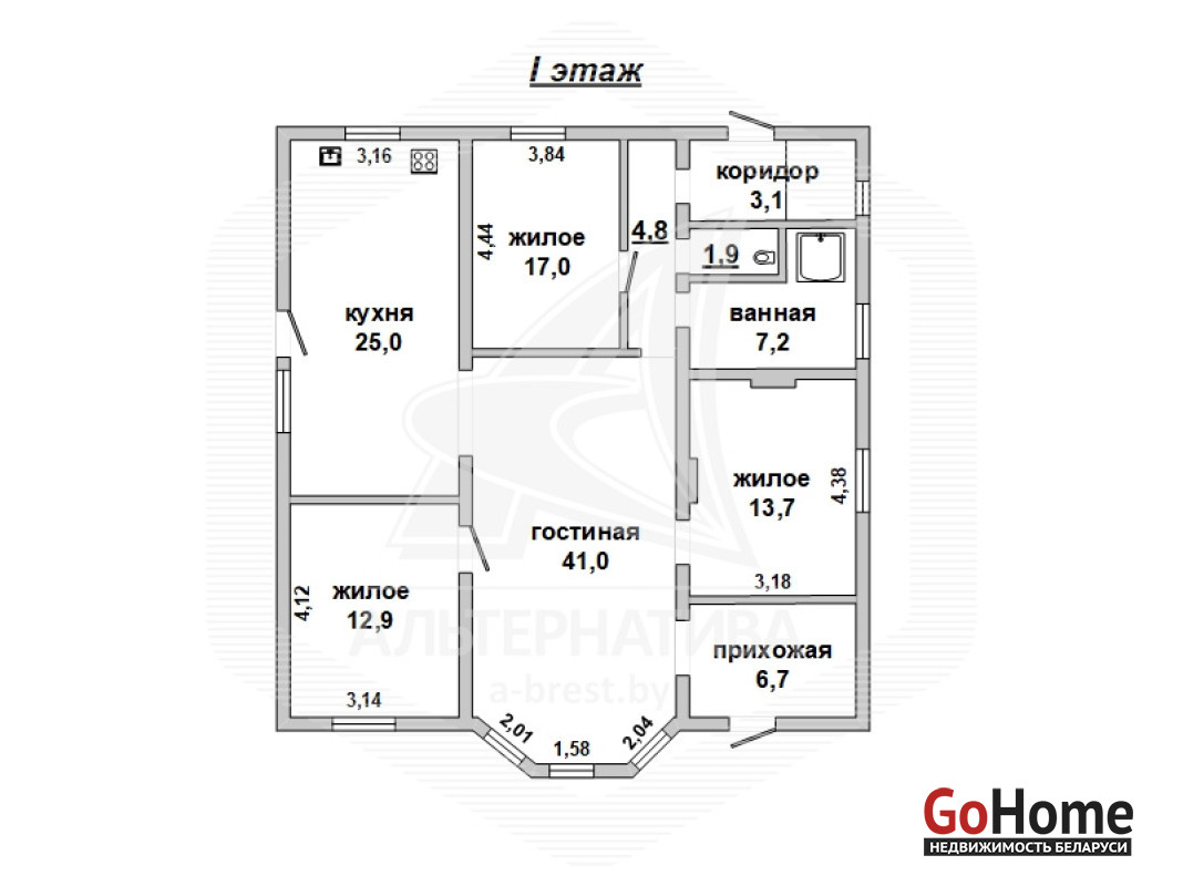 Жилой дом в г.Бресте. 2015 г.п. 1 этаж. Общ.СНБ - 191,6 кв.м, общ.- 133,3 кв.м, жил.- 84,6 кв.м, кух.- 25,0 кв.м. 4 комнаты, высота потолка - 2,80 м.