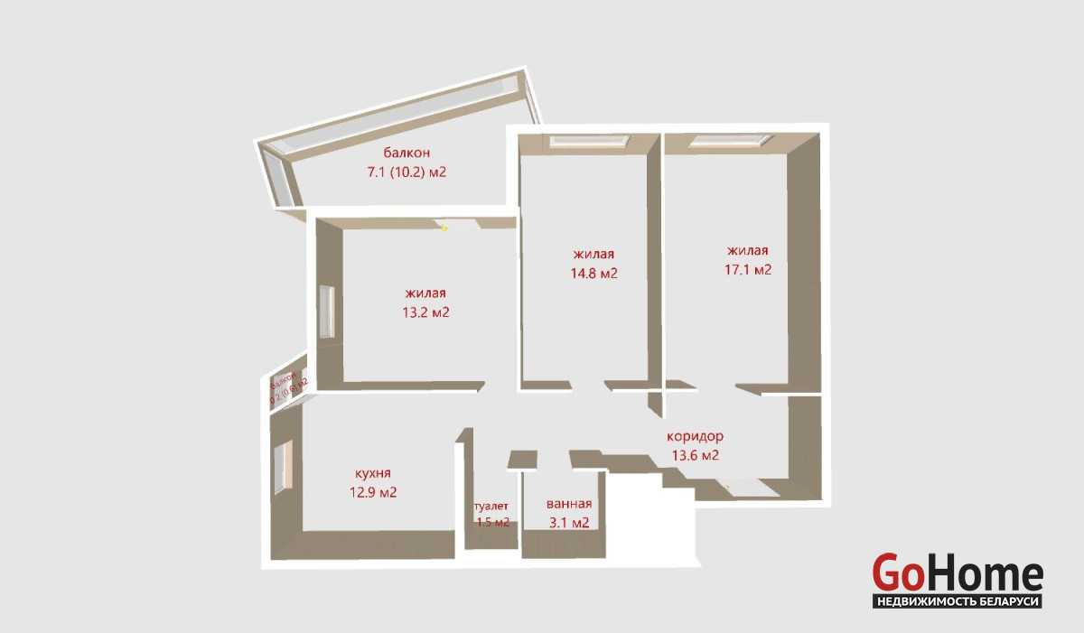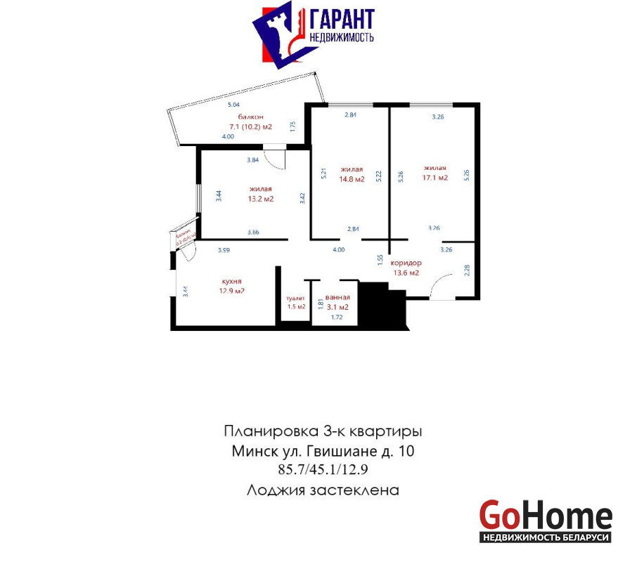 - Детская комната: 13,2 м2, имеет выход на балкон - Кухня: 12,9 м2