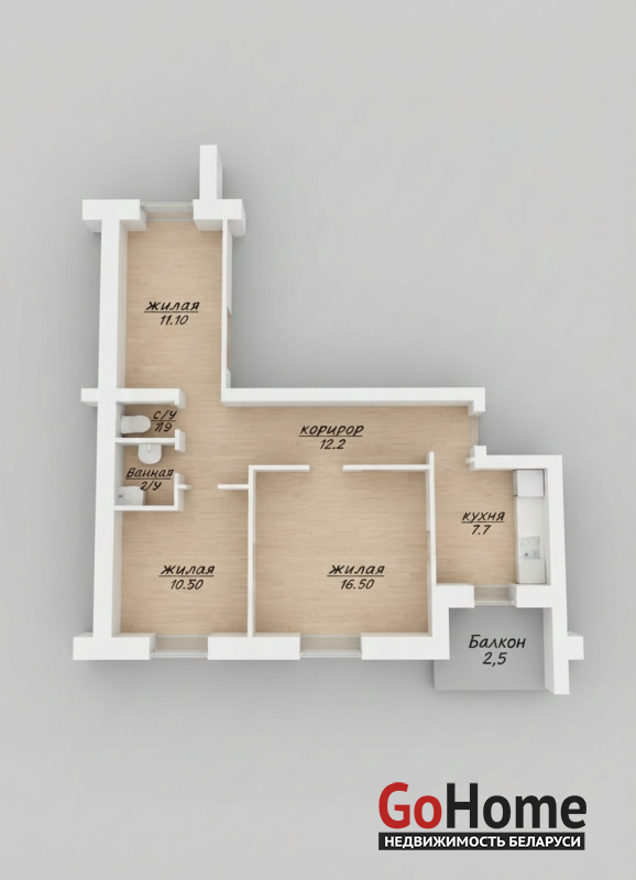 Перепланировка: Кухня расширена за счет выхода на балкон.