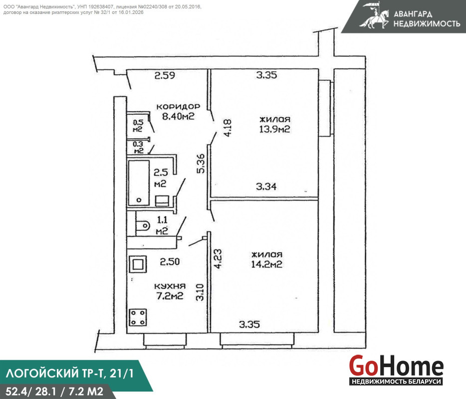 Вся площадь квартиры 52.4 м.кв. жилая –28.1 м.кв.