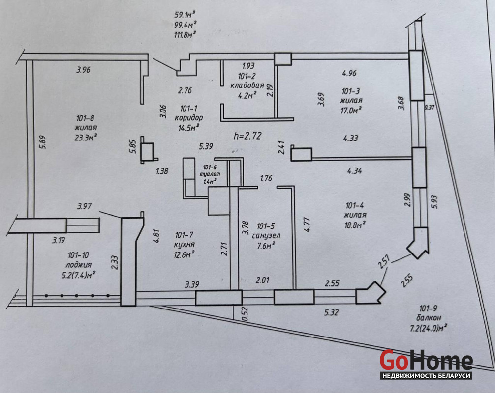 Общая площадь (по СНБ без учета коэффициента) 130.8м2. Жилая площадь 59.1м2. Высота потолков 2.72м. Квартира просторная и очень комфортная. Дом 2016 гп. (каркасно-блочный). Комфортный 23 этаж (из 25).
