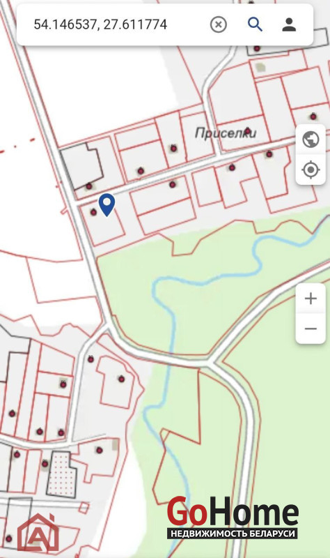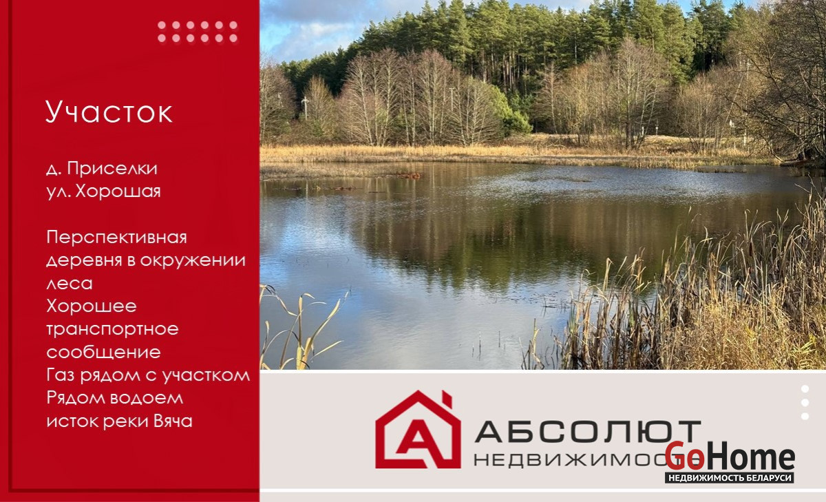 Продается эксклюзивный земельный участок у водоема 25 соток, 19 км от МКАД в современной деревне Приселки, ул.Хорошая, 2 (Мядельское направление, Логойский район).