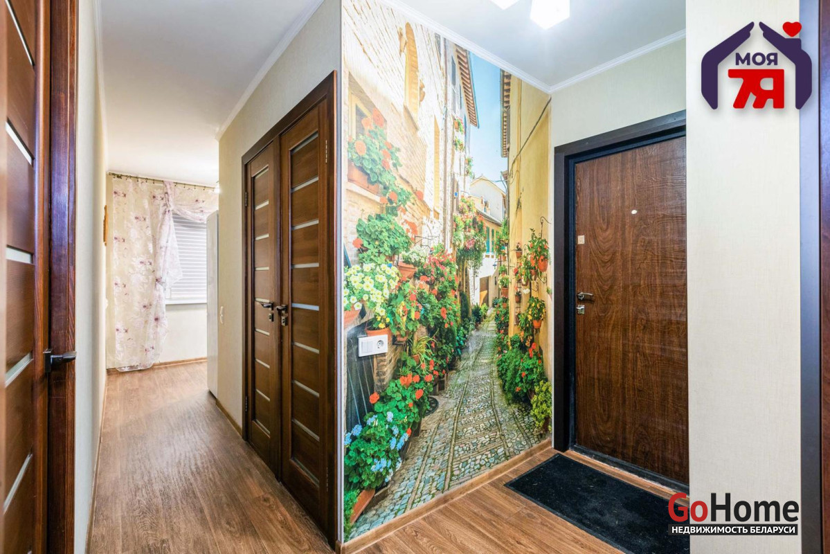 - Прихожая сразу создаёт ощущение порядка: износостойкое напольное покрытие под дерево, спокойная отделка стен, вместительный шкаф с зеркальными фасадами, который визуально расширяет пространство и решает вопрос хранения. Межкомнатные двери выдержаны в едином стиле, с качественной фурнитурой.
