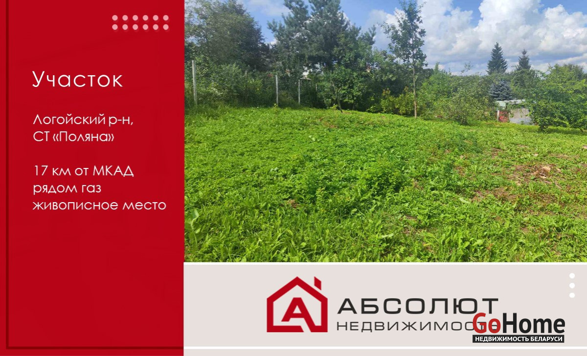 Продается просторный земельный участок 9 соток в садовом товариществе «Поляна» 17 км от МКАД (участок 13) рядом с деревней Беларучи (Мядельское направление, Логойский район, Беларучский с/с). Участок находится в частной собственности. Садовое товарищество газифицировано. Рядом с участком находится газовая труба. Возле участка размещен однофазный электрический счетчик. Есть возможность подключить 380В. Светлый, сухой участок квадратной формы. На участке растут плодовые деревья и кустарники.