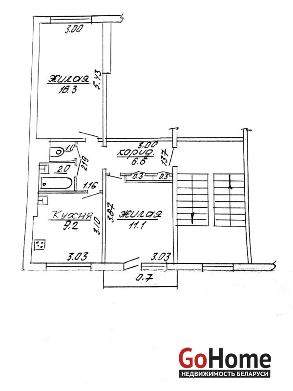 Планировка включает в себя 2 жилые комнаты: 16,3 м2 и 11,1 м2, просторная кухня 9,2 м2.