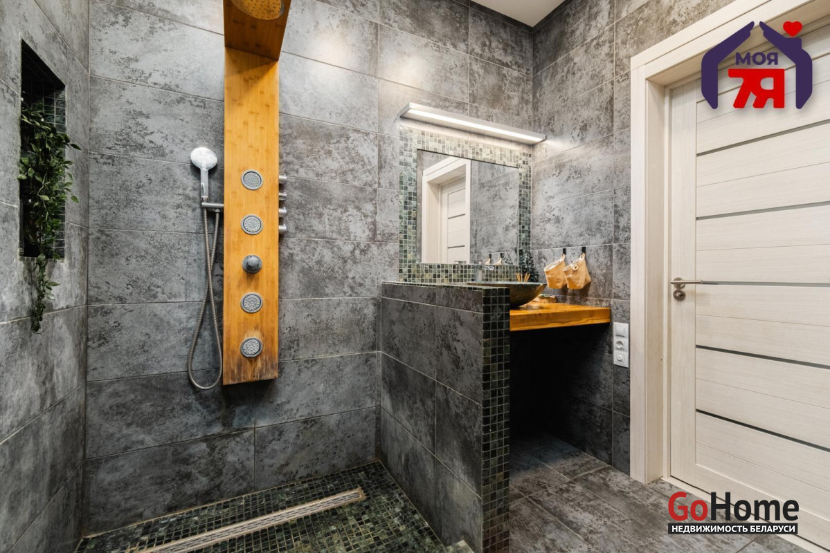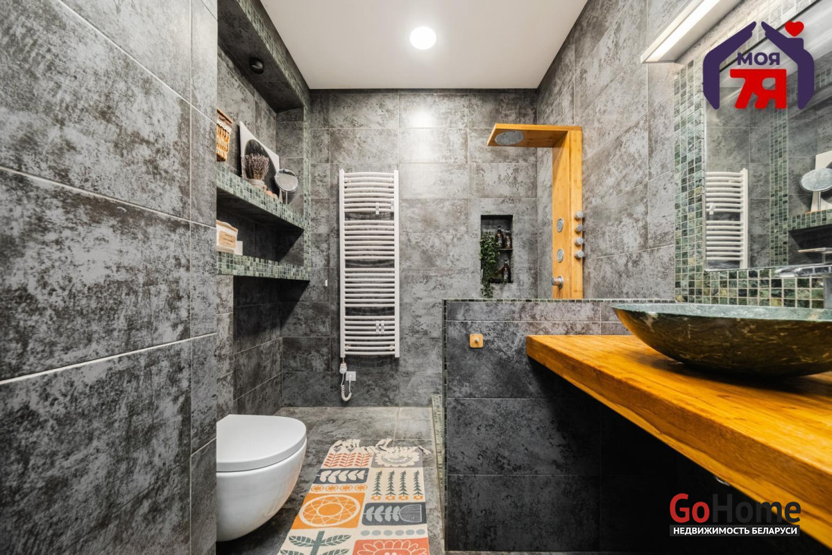 -Санузлы оформлены в стиле «лофт»: плитка под камень, встроенные полки, дизайнерская раковина, стильная деревянная столешница и современный душевой уголок с панелью создают пространство премиального уровня.