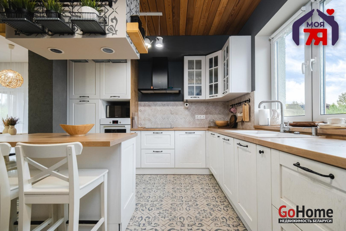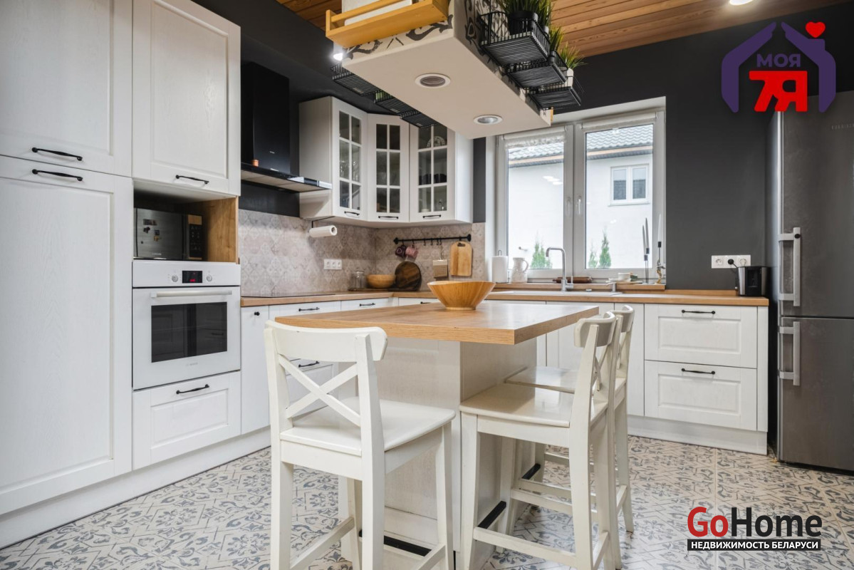 -Кухня - сердце дома, продуманное до мелочей: стильный светлый гарнитур со встроенной техникой Bosch и Electrolux, деревянная столешница и удобный остров. Кухня выполнена из массива дуба. Здесь эстетика сочетается с максимальной функциональностью, а продуманное пространство позволяет собирать семью и друзей за одним столом.