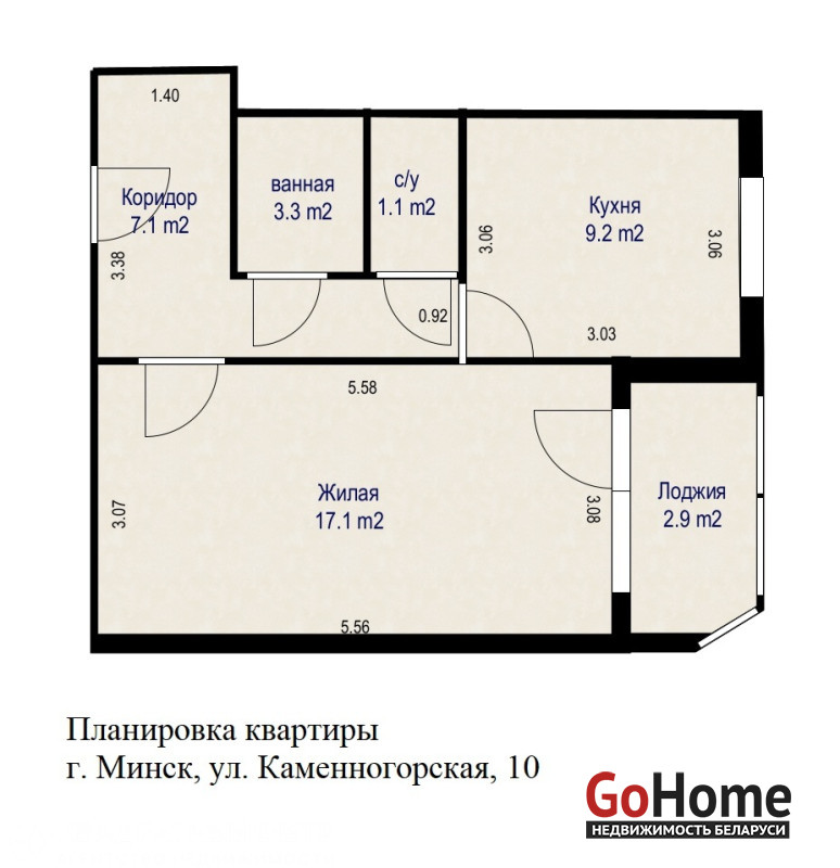 Общая площадь 37,8 кв. м., жилая площадь 17,1 кв. м, кухня 9,2 кв. м. высота потолков 2.55 м., просторная лоджия.