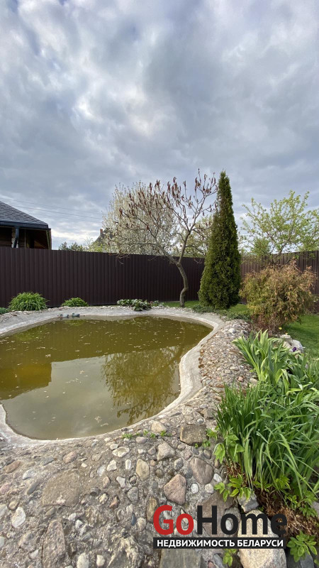 На участке газон с прудом.
