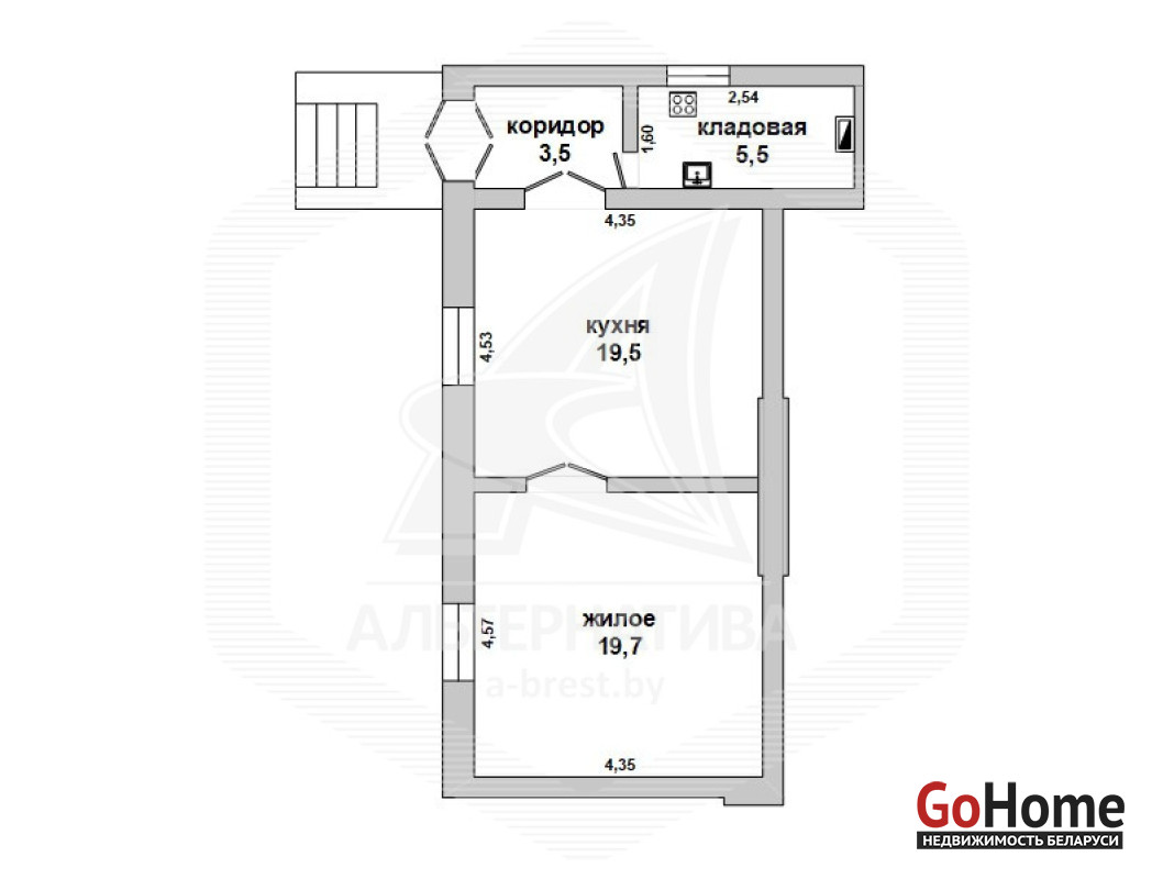Квартира в блокированном жилом доме в г.Бресте. 1925 г.п. 1 этаж. Общ.СНБ - 48,2 кв.м, общ.- 48,2 кв.м, жил.- 19,7 кв.м, кух.- 19,5 кв.м. 1 комната, высота потолка - 3,70 м.