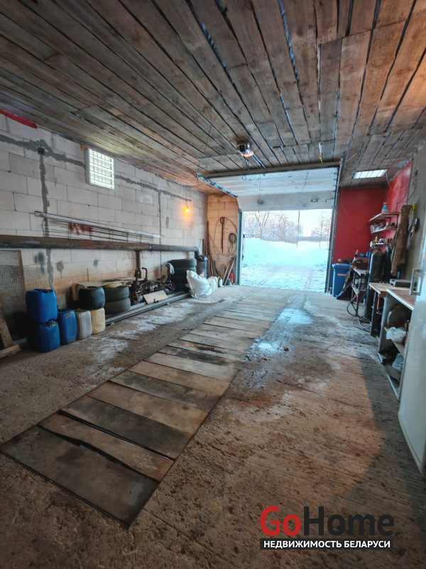 В торце участка расположили большую и удобную хоз. постройку, которая включает в себя: оборудованный гараж на 2 авто, со смотровой ямой, полками для хранения, электричеством и въездом с улицы. Установлены электрические секционные, гаражные ворота.