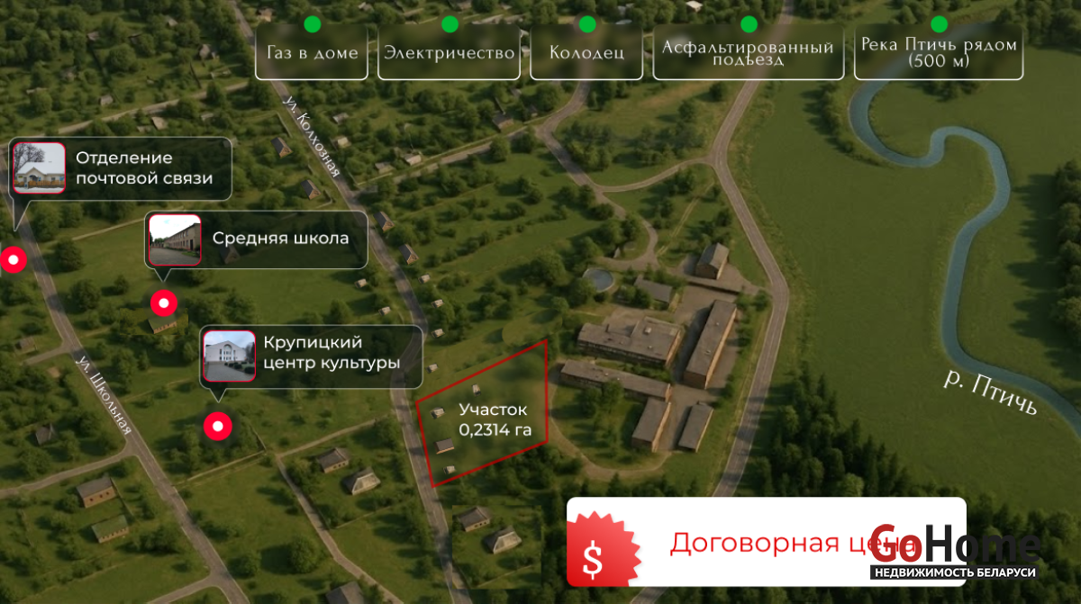 Тихая улица, соседи живут круглый год. В 500 м река Птичь, рядом школа, сад, магазины и транспорт до Минска.