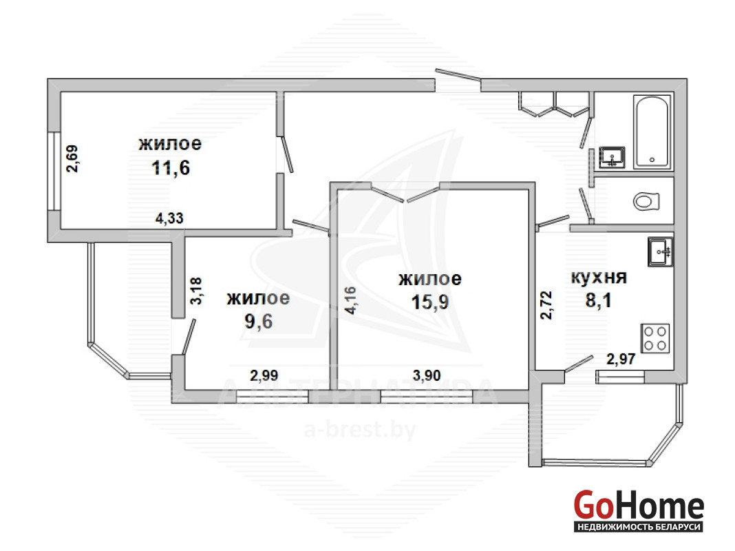 3-комнатная квартира, г. Брест, ул. Гаврилова, 1988 г.п., 4 / 9 кирпич, 63,8 / 61,8 / 37,1 / 8,1, санузел раздельный, подвал, два балкона застеклены, потолки - 2,51 м, телефон, домофон. Квартира без ремонта. Лот - 260102