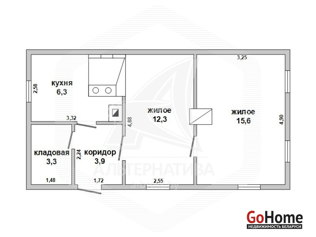 Жилой дом в Жабинковском р-не. 1936 г.п. 1 этаж. Общ.СНБ - 41,4 кв.м, общ.- 41,4 кв.м, жил.- 27,9 кв.м, кух.- 6,3 кв.м. 2 комнаты, высота потолка - 2,50 м.