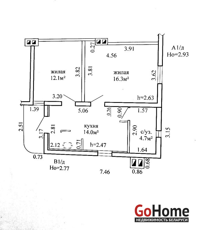 Функциональная планировка квартиры: общая площадь - 47.1 метров квадратных, жилая - 28.4 метров квадратных, кухня - 14.0 метров квадратных. Металлическая входная дверь. Кровля покрыта шифером с организованным наружным водостоком.