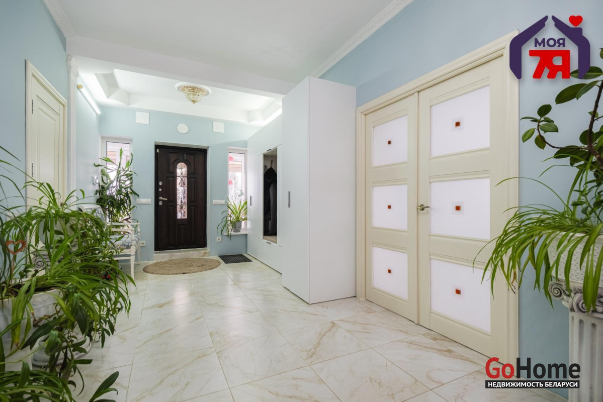 -Интерьер выдержан в спокойной, благородной палитре, с классическими формами и качественной мебелью, подчёркивающей статус дома. На полу - практичная плитка с мраморной фактурой, долговечная и уместная как с точки зрения эксплуатации, так и визуального восприятия, а также уложен качественный ламинат.